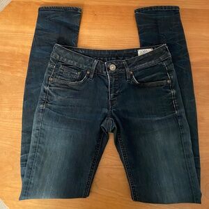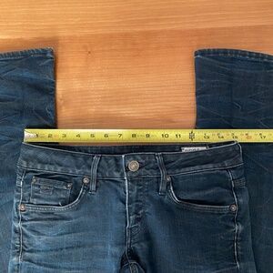 G-Star 3301 low rise skinny jeans in dark wash, size 27 tall. Approximate measurements: 15" flat waist, 7.5" rise and 33" inseam.
