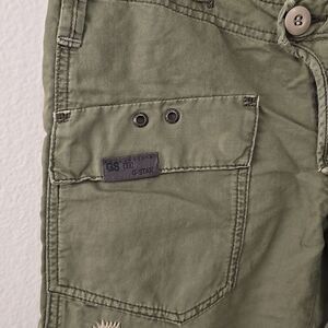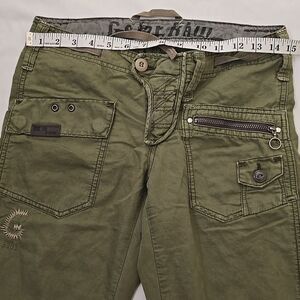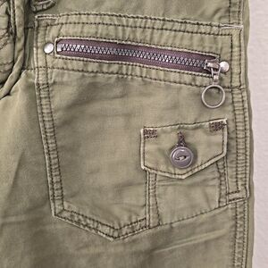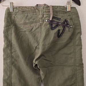 Olive cargo pants with metal eyelet details. Durable fabric. Perfect for casual wear. Great pre-owned condition.
