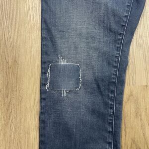 Distressing/repairs: Visible patch repair on left knee and darned repair on right thigh; natural whiskering and fading