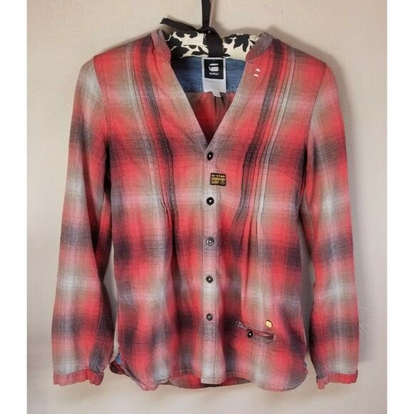 G-Star Raw Denim Womens Split Neck Button Down Plaid Shirt XS Roll-Tab Sleeve