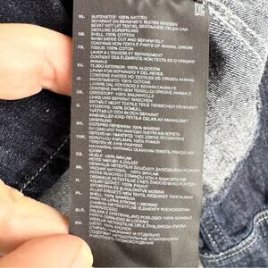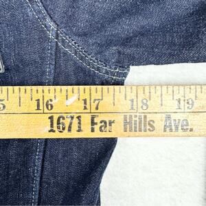 Dark denim button down with one chest pocket and distressing on one side (made to look like pocket used to be there).