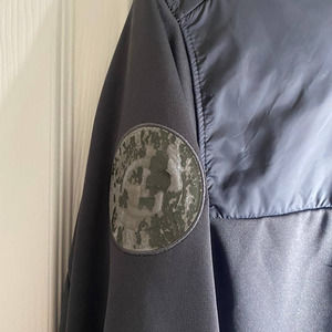 Some peeling in side arm patch . Zippered track jacket in grey color. Zippered side pockets in good condition.