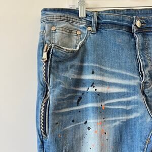 GTFO Distressed Edgy Sequin Paint Splatter Stretch Blue Jeans Mens 40