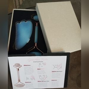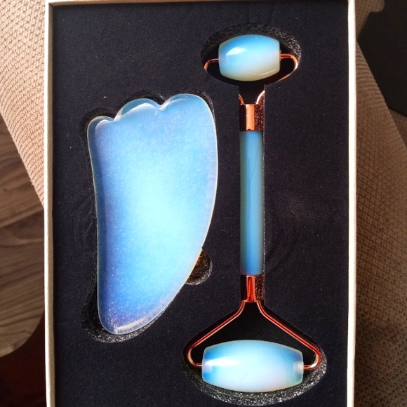 NIB, GUA SHA Opalite Crystal Facial Roller Set, Made from 100% natural and high quality semiprecious stones; Provides gentle yet effective massage for the eyes, face, neck and body; Stimulates collagen production, Reduces cell turnover time, Smoothes our puffiness and inflammation around the eyes and face