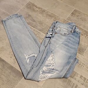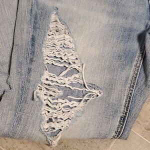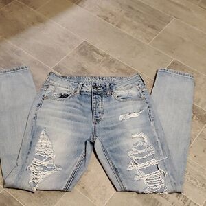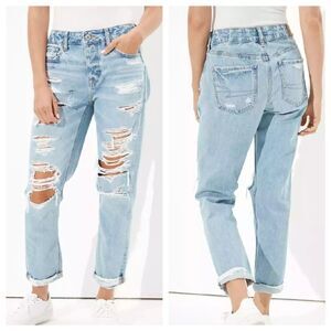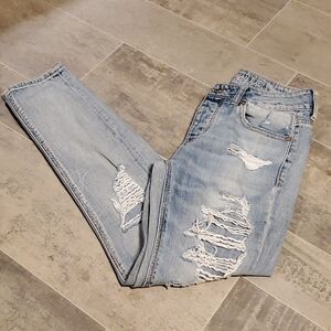 GUC AE Outfitters Tomgirl Destroyed Tappered Jeans, good condition and pale blue with button fly and rise is 9" with inseam of 28". Waist flat is 14", no flaws outside of factory made. Soft and great washed color.