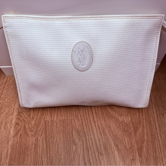Chic Yves Saint Laurent clutch/toiletry pou in a sophisticated cream hue. Features iconic logo detail. Perfect for elegant outings.