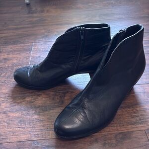 These booties are super cute and sleek! Zip up sides. Good used condition! Very light wear on the inside (brand is partially rubbed off inside heels). Light wear around the top edges (see photos) Great for work, outings, etc! Comes from a smoke free home.