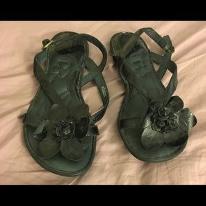 GUC Born black patent leather sandals with flower detail. Leather, normal wear, some curling of the leather flowers. Please see photos or ask questions for further details.