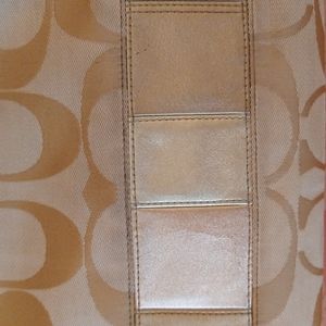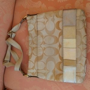 Coach Signature C crossbody bag. Colors are tan and cream canvas. There is a color block line that goes all the way around the bottom of the purse and different colored metallic leather. There is one large coach button on the outside of the purse. There was one large open pocket on the outside in the back. There is one separate pocket and two open pockets on the inside. The bag does show some signs of wear, please see pictures above for detail. There is a canvas adjustable crossbody strap that does need some cleaning. There is some minor cracking on the metallic leather blocks on one side of the bag. Please see pictures above. There is a gold leather badge with serial number on the inside of the bag. Fair to good pre-owned condition.