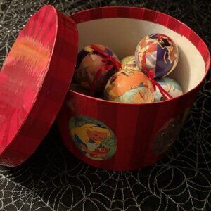 Ornaments come in original box - similar to a hatbox, which does have wear from storage.