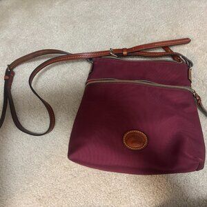 GUC Dooney & Bourke cranberry cloth crossbody swingpack with leather accents