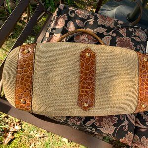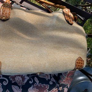 GUC Eric Javits handbag. The outside is in clean, unmarked condition. The inside is a slightly different story. I tend to carry lots of pens and the interior of the bag met up with a uniball pen and at least one red ballpoint pen that came uncapped over the years. There are marks on the inside of the bag at either end and one mark on the label. I took the bag outside in the sunlight to get a good look at the inside. At some point, I tried using a remover product on the spot on the label without success, so I didn't try to remove the stains at the bottom of the bag. Great summer bag and I have enjoyed it, but I need to reduce my bag collection. Measurements 18" x 11" x 7". Drop of straps 10".