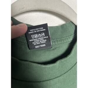 The GUC GOLF WANG Cat Eyes Graphic Short Sleeve Tee in size Medium is a stylish and comfortable t-shirt featuring a crew neck and made of knit cotton fabric. The tee includes accents like burnt matches in the shape of a heart and the Golf Wang logo, making it a unique and eye-catching addition to any wardrobe. Designed with a solid dark green color, this shirt is suitable for all seasons and is machine washable for easy care. Perfect for fans of designer fashion, music, and hip hop culture, this tee embodies the trendy and edgy aesthetic of the Golf Wang brand.