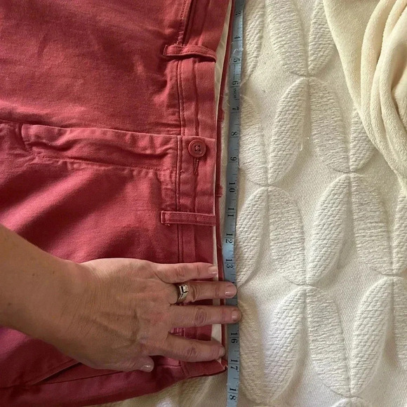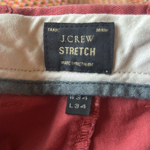 GUC J Crew 1040 Broken In Stretch chino size 34/34 but measure 34/32. Salmon red. Great pair of pants. Comfortable. Casual. Year round wear 99% cotton 1 % elastane.
