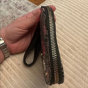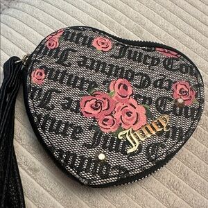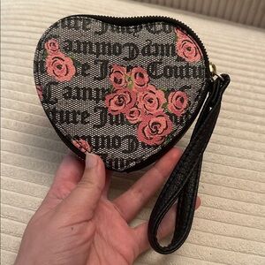 Elegant heart-shaped wristlet with Juicy Couture branding. Features a striking black and pink floral pattern. Ideal for essentials. Strap is good. Zipper is good. Inside will hold your essentials. No callouts. Offers welcome! ☺️🩷🌸