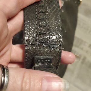 Metallic Faux Snake Silver Gray OrYany LG Hobo Bag, good condition, studs on each top corner in gold and shoulder strap has a 11" drop. I have added a new adjustable strap to be able to wear longer or crossbody but is not included but can be purchased from Amazon so you can wear it crossbody. Interior of bag is Teal, pockets for small items, no odors or tears but shows light use and could use light cleaning, see pictures. lots of storage and holds alot. Please see wear on one shoulder handle end from use but still has life. Good quality piece.