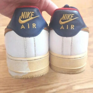 GUC Nike Air Force 1 Low 2007 XXV Charles Barkley Barcelona "Olympic," Size 11. Colors: Gold, Red, Navy Blue, and White.