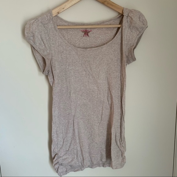 GUC One Step Up Detailed Tshirt features shoulder and sleeve details and side ruching in a light heathered brown