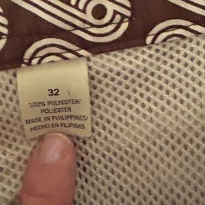 GUC Penguin brand swim trunks with liner, size 32. Drawstring waist. Velcro fly- very secure as it’s a strong Velcro. Brown and white retro design. So cool.