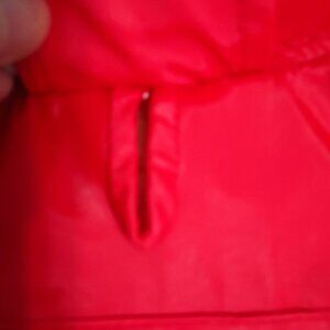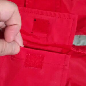 This Pet Rageous Designs Waterproof Dog Rain Coat is in good used condition. There are no stains, no holes, and no marks on this item. The only thing that is missing is one of the plastic tips covering the string that threads through the hoodie. The hoodie has not been impacted by this though.