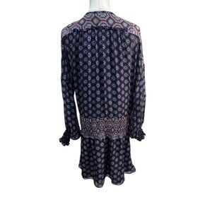 Elegant and chic Ramy Brook New York silk dress in a stunning navy multicolor boho-inspired print. Features a flattering drop-waist silhouette with a wide printed waistband, long sleeves with smocked cuffs, and a slightly flared skirt for a feminine touch. Perfect for day-to-night wear or special occasions.