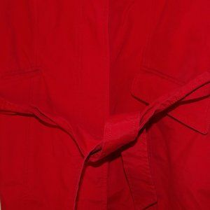 solid red colorway , button down center front has button panel , belted , covered side pockets , material is 70% Cotton 30% Nylon for face , back is 100% Cotton , sleeve lining is 100% Polyester Dry clean only , Sz 14 measurements are roughly 33" from shoulder to hem and about 20" pit to pit , Good Used Condition No Issues , Pet friendly non smoking home