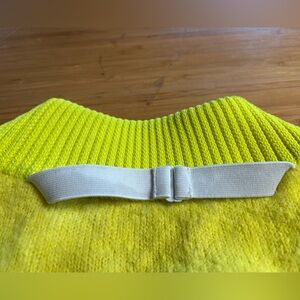 Long sleeve knit alpaca-blend pullover in lemon yellow. Rib knit technical jersey v-neck collar featuring white elasticized band with hook-eye fastening at back. Technical jersey lining at rib knit cuffs. Rib knit hem. Dropped shoulders. Tonal stitching.