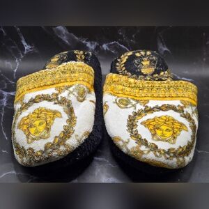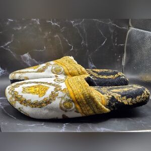 Versace "I Heart Baroque" luxurious slippers featuring signature Baroque print. Rounded toe. Slipon style. 100% Cotton. Hand wash. Made in Italy.