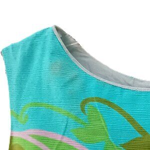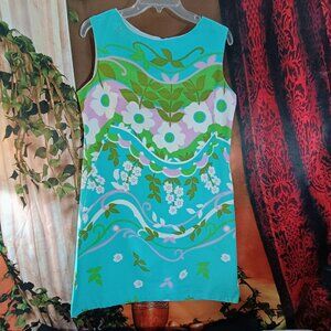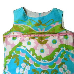 Good Used Condition: Vintage Alex Colman Blue Mod Floral Shift Dress is beautiful and vibrant example of classic 1960s mod fashion. The sleeveless shift dress features a striking psychedelic floral pattern in a mix of turquoise blue, lime green, soft pink, and white. As is common with vintage apparel, the sizing may differ from modern garments. This piece is a perfect addition for any vintage clothing collector or anyone looking for a unique, eye-catching item. Size: vintage sizing may vary, please refer to the photos and measurements for the most accurate fit, approx. 20" bust flat (about 40"circumference). Please note: there are a couple of small repairs near the hem and faded discoloration near the neckline, which are consistent with the age of the garment (see images for details).