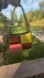 Stylish handbag with a color block patchwork design. Features black, yellow, and red panels.