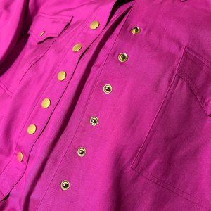 GUC Vintage IB Diffusion 100% silk blouse from the closet of an older relative who has downsized. This blouse has a spill stain on the top of the left shoulder that I am fairly sure will come out with a dry cleaning (in photos), but I have not tried it. There is also a very small dot on the back of the left sleeve, not evident unless looking for it (in photos). Measurements: pit to pit 24", length 30" . A lovely color and great option as an overshirt. From a smoke free and dog friendly home.