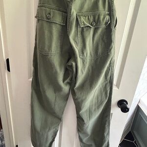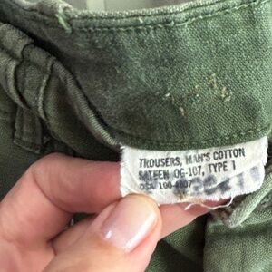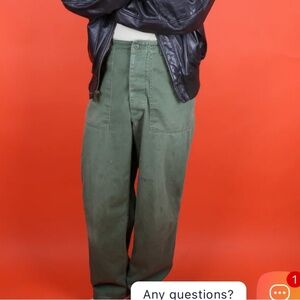 Fatigue button fly high waist full length soft everyday wear. Flap pockets. Button fly. Classic. Enlisted. Army. History. Wartime. Soldier. Type 1 olive green marine trending fashion style original uniform grunt authentic antique collectible unisex size small. Would fit a size Small/size 4/6 woman. Size S/M men’s. Trousers
