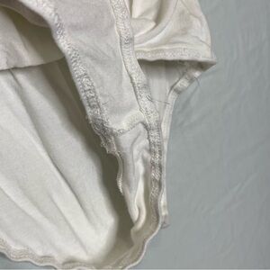 Elegant white bodysuit with ruffled neckline. Short sleeves add a chic touch. Perfect for layering or wearing alone. Has some slight thread fraying near the bottom shown in last pic