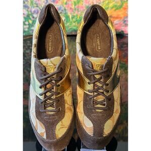 Good used condition women's Coach "Lexey" sneakers, size 6.5. These lace up shoes feature deep chocolate brown suede and metallic gold leather accents over Coach's signature "C" logo. The laces are in great condition. Minor pilling and mild fading on a couple areas of the suede but the flaws are minor. Very few signs of wear otherwise. They are beautiful sneakers!