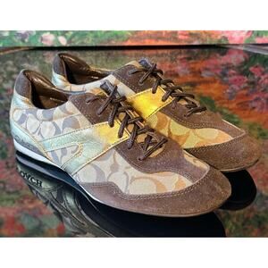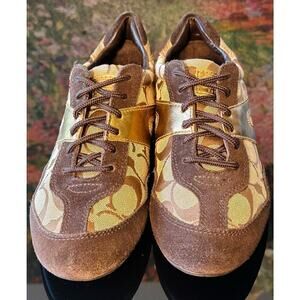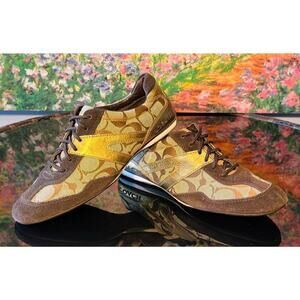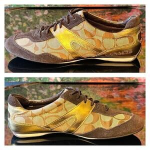Good used condition women's Coach "Lexey" sneakers, size 6.5. These lace up shoes feature deep chocolate brown suede and metallic gold leather accents over Coach's signature "C" logo. The laces are in great condition. Minor pilling and mild fading on a couple areas of the suede but the flaws are minor. Very few signs of wear otherwise. They are beautiful sneakers!
