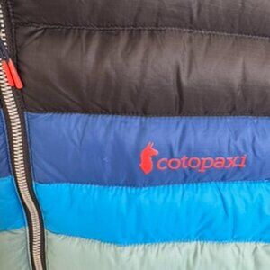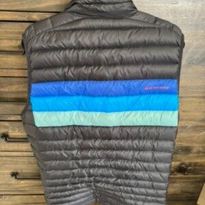 Selling a good used condition cotopaxi Fuego down vest, Men's size large. 2022 black and blue striped colorway, this vest has a small snag in the body (shown in photos to the left of the red cotopaxi logo) but the snag doesn't go all the way into the cavity where the down is held, its superficial.