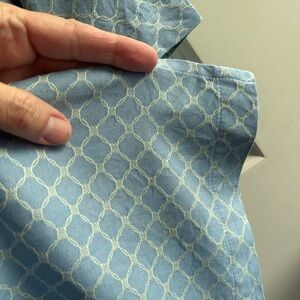 GUC size XL Sette Ponti Blue Patterned Men's Silk blend shirt. Button up. White embroidered pattern on fabric. A couple very faint stains - barely noticeable at all and near the hem. (See pic) Would look so good paired with white shorts or pants.