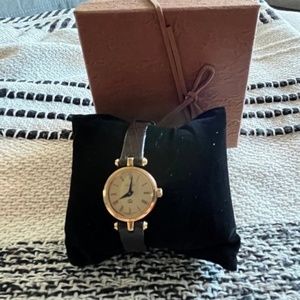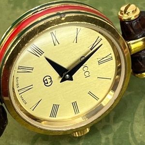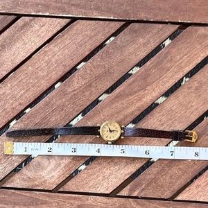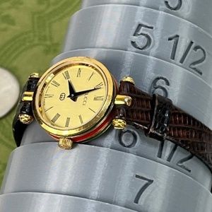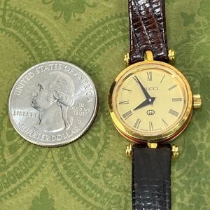 Authentic GUCCI 2000L vintage STACK sherry line Gold Dial ladies WATCH 80's era. Has Brand New battery installed and works excellent!! Still has its original Swiss Jewel movement inside!! There are some marks and scratches on the case. Glass/Crystal is clear. The Leather strap near one of the mount hold has a crack on the leather, but not all the way thru, and the strap still holds together firmly. Fits a 5" to 6 1/2 inch size wrist.