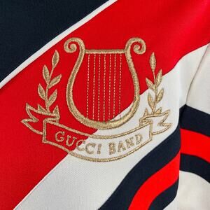 GUCCI by Alessandro Michele 2019 jacket in a black and red polyester cotton blend fabric featuring a color block style with gold tone "Gucci Band" embroidery, elastic cuffs and hem, and zip up closure. Made in Italy.