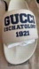 New Authentic Cream slides from Gucci. Made of leather, this design features a raised logo, navy print and cream rubber sole. Sole height: 1cm Sole at the highest point: 2cm This is a size 7 slides