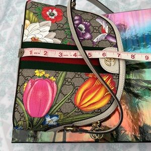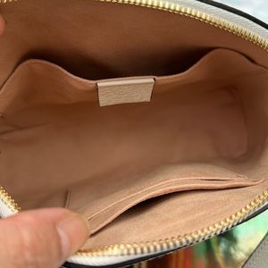 The crossbody is in excellent condition. The purse is in good, signs of wear inside and outside. The white Leather trim has color transfer from used and few scratches on the white leather.The GG gold logo is intact. The canvas is great.