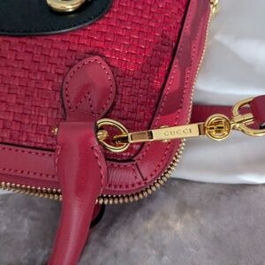 This is an authentic GUCCI Straw Azalea Calfskin Woven Mini Horsebit 1955 Top Handle Bag in Coral Wave and Black. This chic tote is crafted of traditional Gucci GG canvas. The bag features a horsebit detail at front, leather strap top handles, an optional adjustable shoulder strap, and red leather trimming with light brass hardware. The top zipper opens to a beige fabric interior.