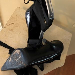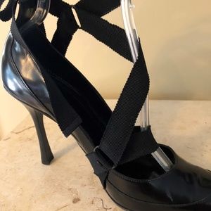 This is a fun GUCCI pump with a long grosgrain ribbon that lays at an angle across the front and wraps around the ankle. Long enough to get creative and tie in the front or back. Worn once or twice and in excellent condition. There is a slight crease in the left toe leather but does not detract from the shoe. Wood stacked black heel 4". Dust bag included. Labeled 9.5 but would best fit 9 so that is how I am listing.