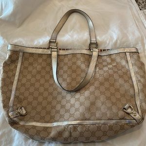 GUCCI Abbey GG Beige Canvas Metallic Leather Shoulder Bag E/W Tote Vintage