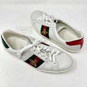 GUCCI Ace Embroidered Gold Bee White Sneakers with Red and Green Stripe