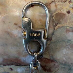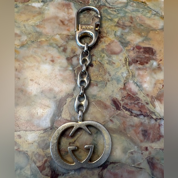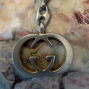 Authentic GUCCI rare vintage keychain silver and gold tone. This is in good pre owned with light has scuffs from normal wear. The charm is 4 5/8 inches in size and is stamped “Italy” This unisex accessory is perfect for adding a touch of luxury to your keys or bag.