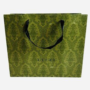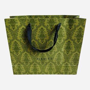 Authentic GUCCI paper shopping bag tote featuring a green damask print with embossed details, perfect for gifting or luxury storage. This tote measures approximately 12.5"x4"x9.5", offering a stylish yet practical size. Made from high-quality paper, it showcases the iconic GUCCI elegance and design. The bag is in good plus condition, showing minor wear consistent with gentle use but retains its collectible value. Ideal for GUCCI enthusiasts, fashion lovers, or as a chic gift presentation. Elevate your luxury shopping experience with this genuine designer tote that highlights both style and functionality.