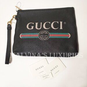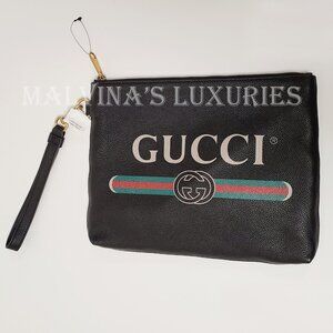 Unique Features: Gucci clutch / Pouch features wrist strap, top zip fastening, an iconic web / interlocking GG Logo print on the front. Pebbled leather. Antiqued brasstone hardware. Will fit your wallet, keys and standard phone. Retail is $1,200 plus tax.