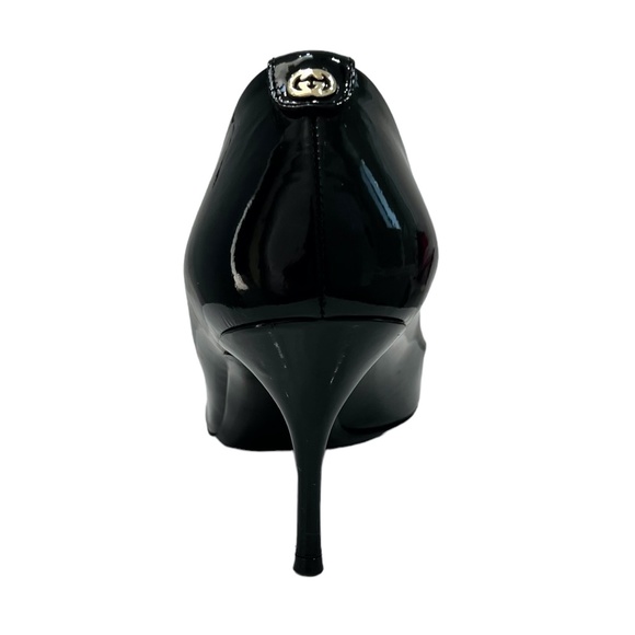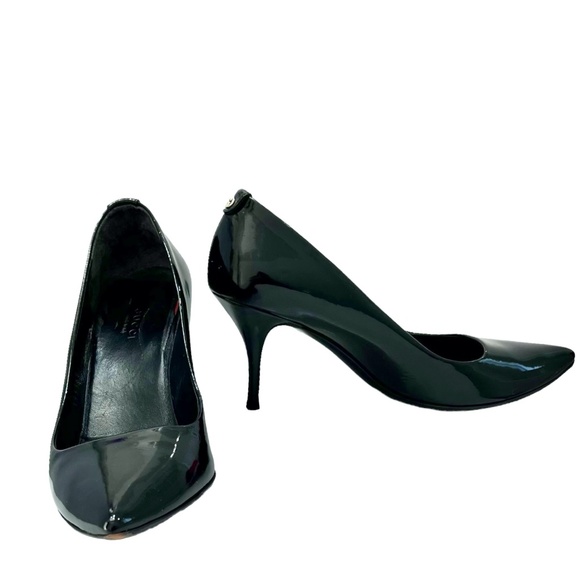 Gucci black patent leather pointy toe stiletto heel. Silver logo on the back of the shoe. Overall in good condition. The inside leather of the right heel just above the tip is a little wrinkled. The insoles are off center from wear. There is a .25" scuff on the front point of the left shoe. Should come off with polish. Some scuffs from wear. See photos for all details.