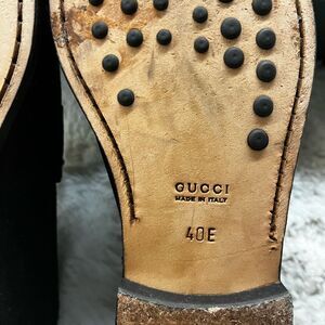 Authentic Gucci Horsebit Loafers in Italian size 40E (US men’s ~7), crafted from Castoro black suede leather with leather/rubber injection soles. These iconic moccasins feature Gucci’s signature gold Horsebit hardware and were barely worn once, showing virtually no wear. Stored properly in the original dust bag and box. These Gucci loafers feature a classic slip-on design in luxurious black leather suede, accented with gold-tone hardware for a touch of elegance. They are in near-mint condition, worn once and with barely any wear on the rubber-injected leather soles. Size: 40E IT (fits like US Men’s 7 with standard width) Included: Original Gucci box, branded dust bag, product tag and factory code label. Shoes will be shipped double-boxed for protection. These loafers are 100% authentic Gucci, purchased directly from a Gucci retailer. Box includes original product tag and model code OF30427, which matches the shoe’s style and construction. No aftermarket modifications or resole work. Trusted seller with a background in vintage/estate luxury resale.